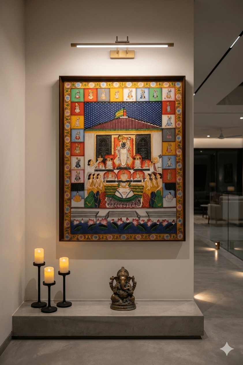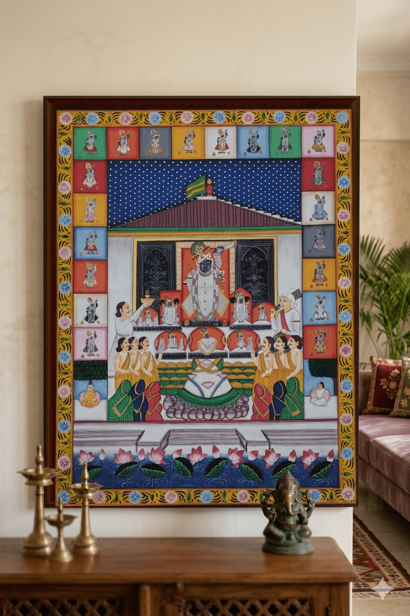 History and Origin: Pichwai painting originated in the 17th century in Nathdwara, Rajasthan, home to the Shrinathji Temple, which is dedicated to Lord Krishna. Artists from this region created these paintings to depict Krishna's life and stories, and it’s also known as Shreenathji painting.