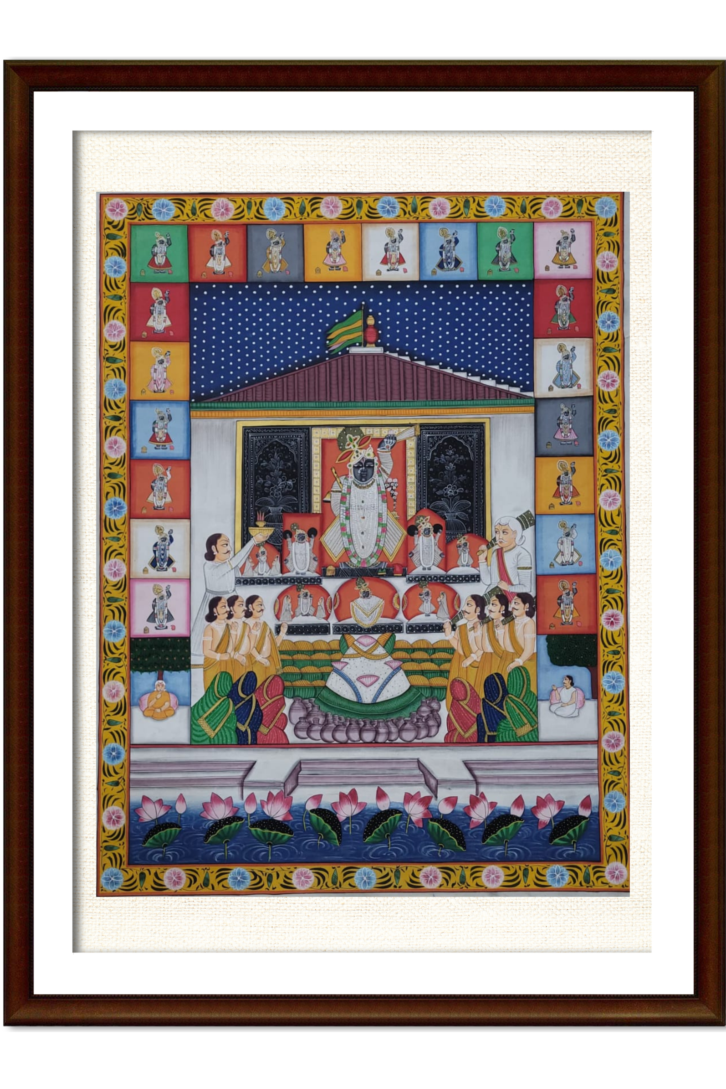 "Annakut" also known as Govardhan Puja means "mountain of food," and this painting depicts the festival where a large variety of vegetarian food is offered to Krishna as a mark of gratitude. The central figure is Shrinathji, a form of Lord Krishna. The scene commemorates the event where Krishna lifted the colossal Govardhan Hill with his fingertip to protect the villagers of Braj from a storm caused by the rain god Indra. To show gratitude for this divine protection, devotees prepare a grand offering of vegetarian dishes, arranged to resemble the Govardhan Hill, symbolizing abundance and divine grace. The composition provides a detailed perspective of the temple shrine decorated for the occasion.