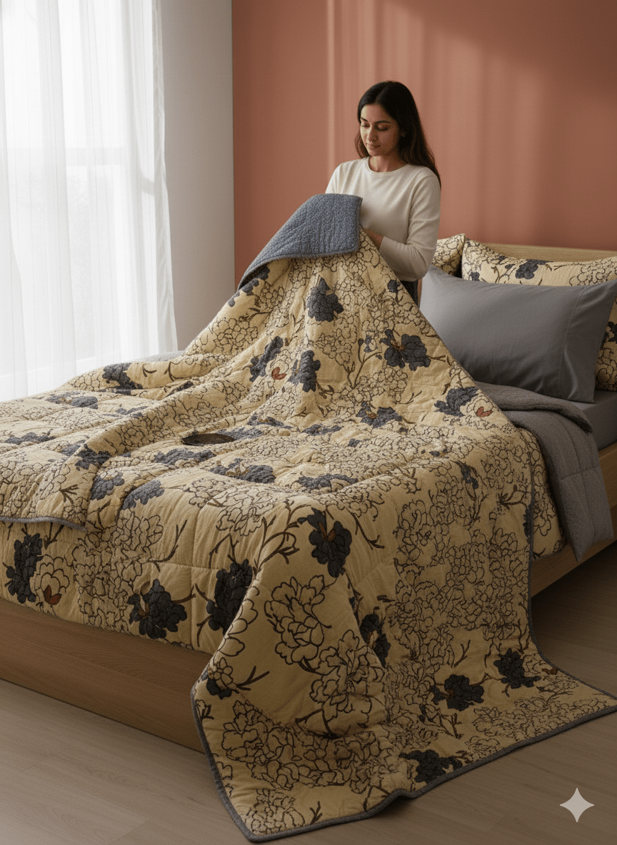 A blanket is a single layer of thick woven fabrics designed for warmth and comfort, perfect for snuggling, picnics, or as decorative throws.A comforter is a thick, quilted or fluffy bed covering with a decorative outer shell and a insulated filling. A quilt has three layers: a decorative top, a middle filling, and a back, stitched together in a pattern. Blankets, quilts, comforters, and dohars are popular bedding essentials that serve both functional and aesthetic purposes. Dohars are traditional Indian blankets or throws, often reversible, adding a pop of color and texture to beds, sofas, or chairs. Often available in various sizes and pattern choose as per your need of warmth and choice of you style.