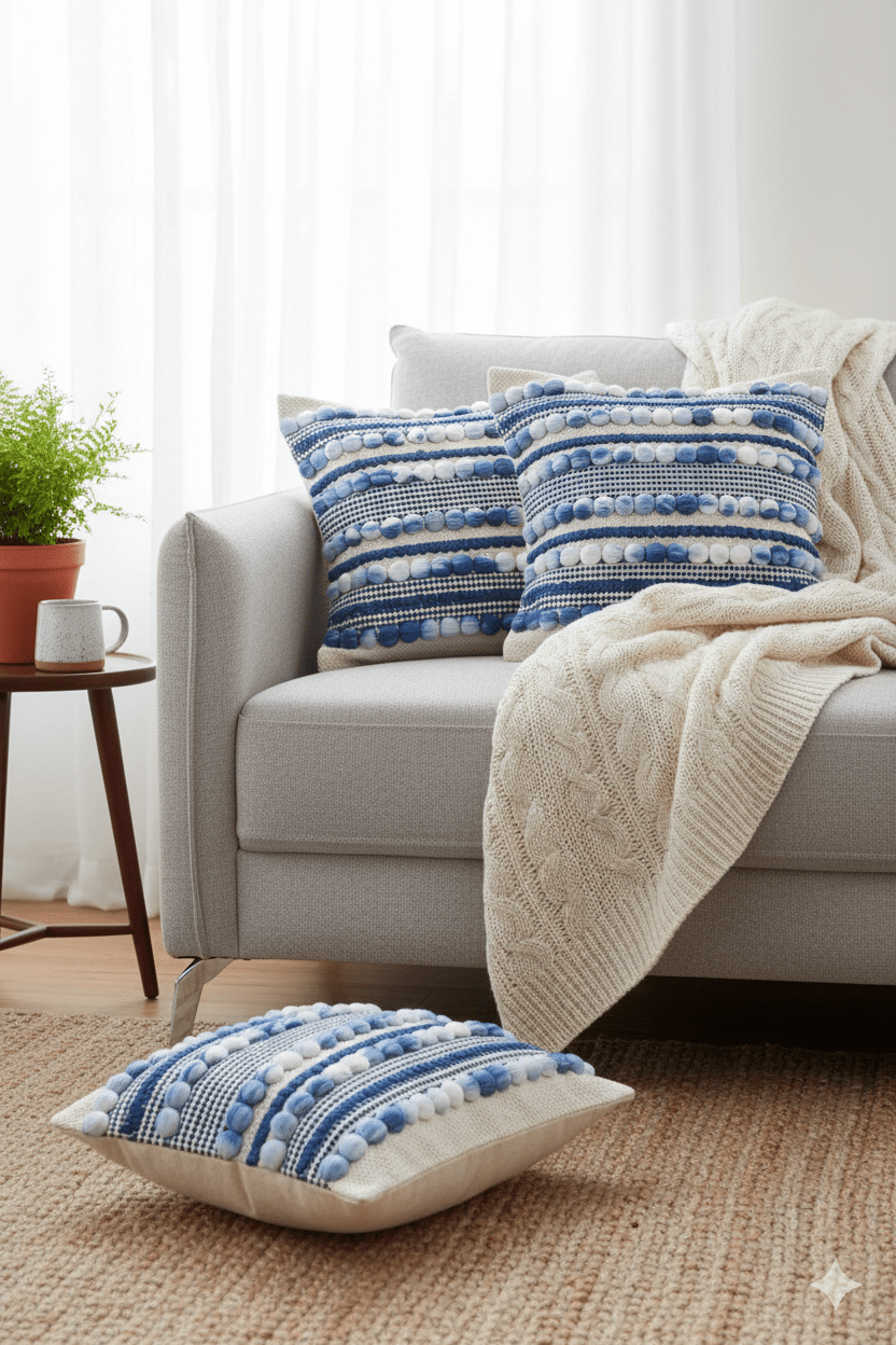 Cushion covers and throw pillows are decorative accents that add comfort, texture, and personality to your home. Cushion covers slip over existing cushions for a fresh look, while throw pillows are decorative additions to sofas, chairs, and beds. Available in various sizes (Shaped Cushion, Round Cushion, 12inchx12inch, 18inchx18inch, 20inchx20inch, 24inchx24inch and lumbar). They can be styled in multiple ways, such as layering, color blocking, or mixing patterns and textures.
