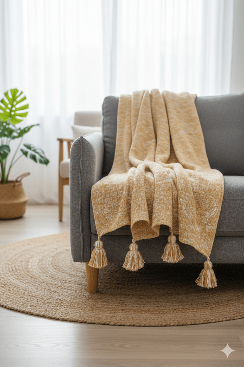 Sofa throws, also known as throw blankets, are a lightweight, decorative blanket draped over a sofa or couch to add texture, color, and warmth. To style it, simply drape it casually over the back or arm of the sofa, or fold it neatly and place it on the armrest. You can also layer it with other throws or pillows to create a cozy and inviting atmosphere. Choose a throw that complements your room's color scheme and style to add a touch of elegance and warmth to your living space.
