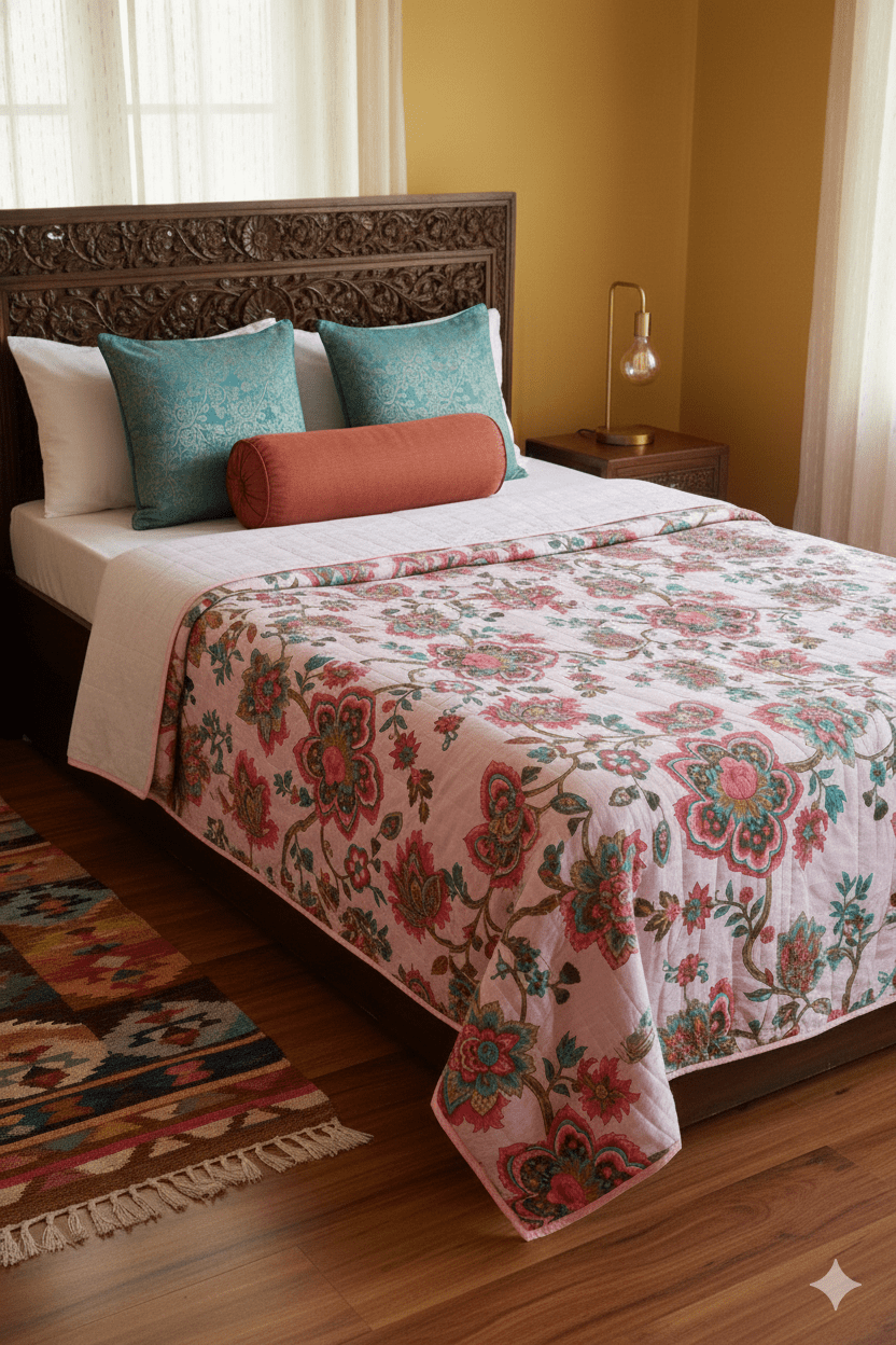 A blanket is a single layer of thick woven fabrics designed for warmth and comfort, perfect for snuggling, picnics, or as decorative throws.A comforter is a thick, quilted or fluffy bed covering with a decorative outer shell and a insulated filling. A quilt has three layers: a decorative top, a middle filling, and a back, stitched together in a pattern. Blankets, quilts, comforters, and dohars are popular bedding essentials that serve both functional and aesthetic purposes. Dohars are traditional Indian blankets or throws, often reversible, adding a pop of color and texture to beds, sofas, or chairs. Often available in various sizes and pattern choose as per your need of warmth and choice of you style.